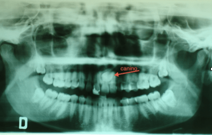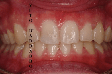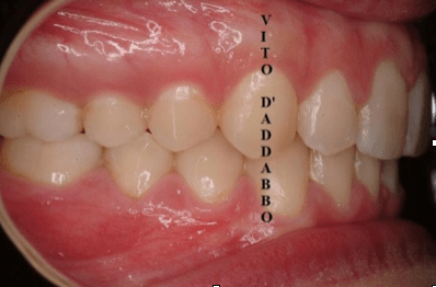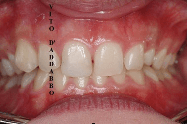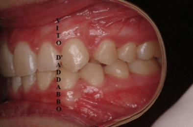 Non di rado accade che manchi in arcata il canino permanente superiore. Questo può essere dovuto a mancanza di spazio ma anche a problemi di eruzione del dente che si colloca lontano dalla propria sede. Nel caso di questa paziente, che presentava anche un grave morso coperto, il canino era dislocato palatalmente e molto distante dalla propria sede. Previo un piccolo intervento chirurgico è stato agganciato e portato in arcata.